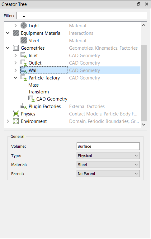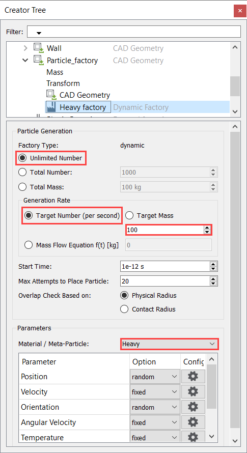 これでBulk Materials 、形状セクション、Equipment Materialが定義されたので、次は粒子を生成するためParticle Factoryを作成する必要があります。Bulk Materials ごとに1つのファクトリを作成します。