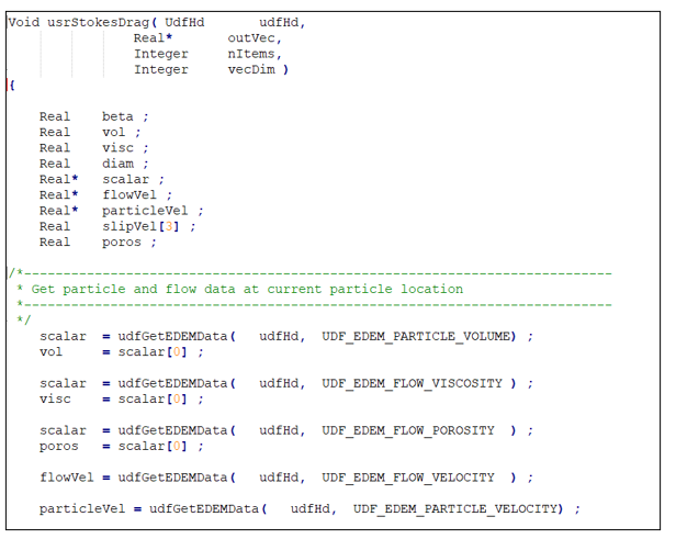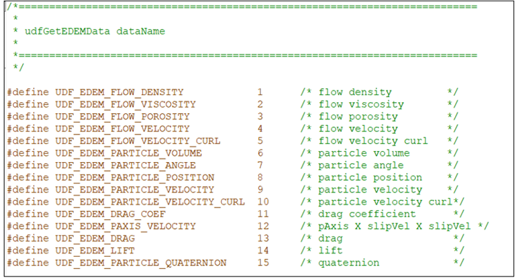 AcuSolveから粒子および流体データへのアクセスに使用されるルーチンは、udfGetEDEMData(udfHd, dataName)です。これはデータの配列を返し、配列の長さは要求されるデータのタイプに依存します。