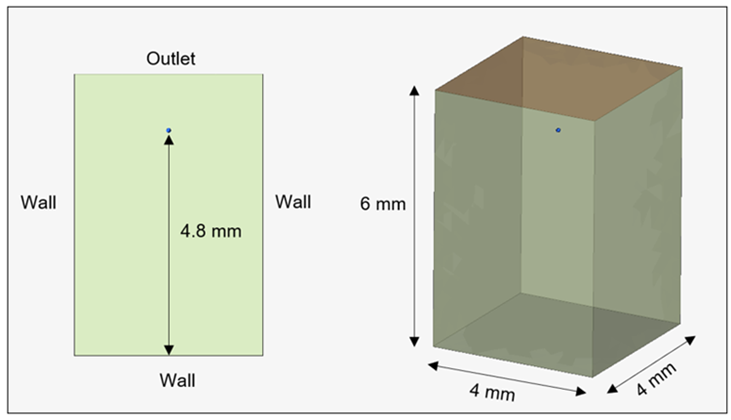 シミュレーションの目的は、水柱中を落下する固体粒子の終端速度を計算することです。粒子の初期位置は、水柱の底面から4.8mmの位置です。Stokes流れでは、粒子は最初に重力によって加速され、流体の抗力は無視できます。流体中を粒子が移動すると、摩擦抗力が増加し、加速が時間とともに低下してゼロとなり、その後粒子は終端速度と呼ばれる一定の速度で移動します。