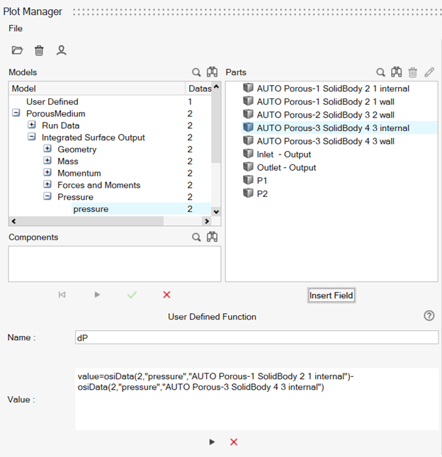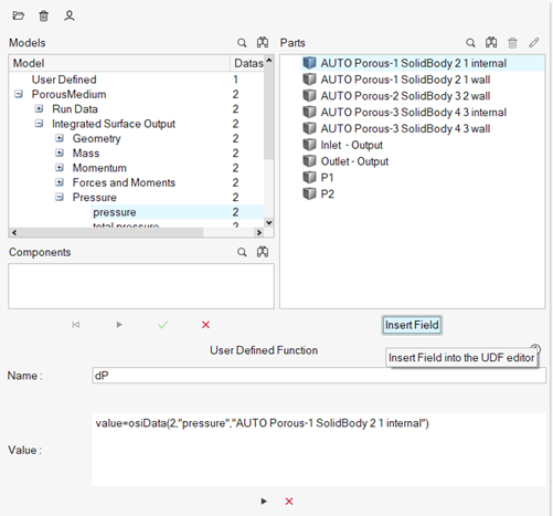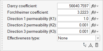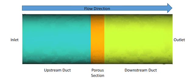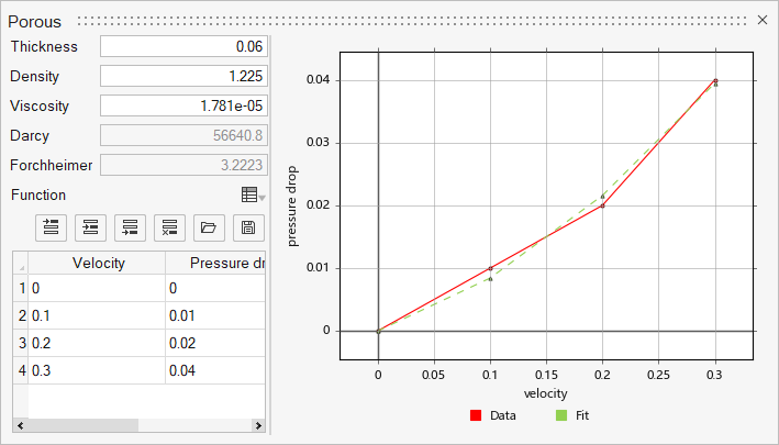 ここで は多孔質領域での圧力低下(Pa)、 は多孔質領域の長さ(m)、 は透過率、 はダルシー係数、 はフォルヒハイマー係数、 は粘度(kg/m-sec)、 は密度(kg/m3)、 は速度の大きさ(m/sec)、 は速度(m/sec)です。
