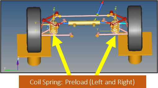 複雑なマルチボディシステムは、数多くの方法で組み立てることができます。多くの場合、システムの組み立て方法として設計者が最も望ましいとした方法が1つあります。次の図に示すサスペンションシステムを考えます。サスペンションの設計者は、ホイールに対する垂直力の具体的な値とホイールのトー角の規定値を使用してシステムを組み立てることが望ましいと考えています。