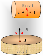 - type = "PARALLEL_AXES"図 7 は、PARALLEL_AXESプリミティブの概略図を示しています。このプリミティブは、Reference_Marker(下図のI)のz軸が、Body-2上のReference_Marker(下図のJ)のz軸に常に平行になるように、Body-1を拘束します。