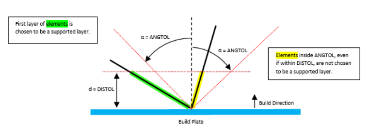 - ANGTOLフィールドとDISTOLフィールドを使用して、最適化時に常にサポートされると見なされる要素を定義できます。候補要素は、構築方向に移動する際に見つかる1つ目の層内にあるそれらの要素すべてです。この層がANGTOLで指定された角度より大きく傾いており、DISTOLで指定された距離内にある場合は、常にサポートされます。常にサポートされる要素は、“事前定義済みサポート”という結果タイプでH3Dファイルに出力されます。パートの実際の製造のためには、この事前定義済みサポートの一部のセクションにサポート構造が必要になる場合があります。