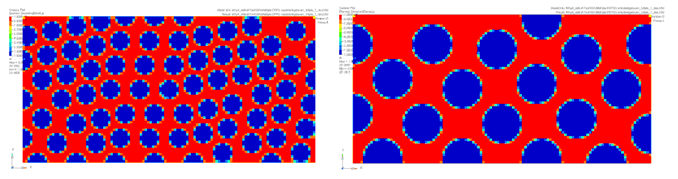 図 3. 生成されたチーズ状の初期設計. (左)デフォルトでの設計(右)穴半径を倍にした設計 - HOLERADの値を変更すると、異なる初期設計が得られます。図 3(右)の初期設計には、図 3(左)の倍の穴半径を持つ多数の穴があります。均等な配置で整列した穴(規則的な構造の設計領域に適しています)を設けた初期設計を作成するには、HOLEINSTをALIGNに設定します。各方向の穴の数は、NHOLESX、NHOLESY、NHOLESZを使用して詳しく指定できます(図 4)。