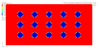 - デフォルトでは、設計領域全体にわたって適応配置された穴を持つチーズ状の初期設計が、OptiStructによって自動的に作成されます(図 3)。デフォルトの穴半径は平均メッシュサイズの5.0倍です。