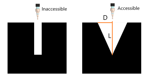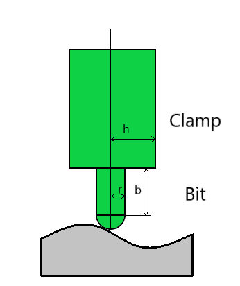 - トポロジー最適化のフライス加工制約条件は2通りの方法で定義できます。1つ目は、ANGLEフィールドを使用してアクセス角度を直接定義する方法です(ANGLEは、図 6に示すようにD/L比率です)。2つ目は、R、B、およびHフィールドを使用してミルビットとミルヘッドの寸法を定義する方法です(これらのフィールドは、図 7のr、b、hの値と同等です)。OBSTキーワードと継続を使用して、フライス加工制約条件の最適化時に考慮する障害物を定義できます。