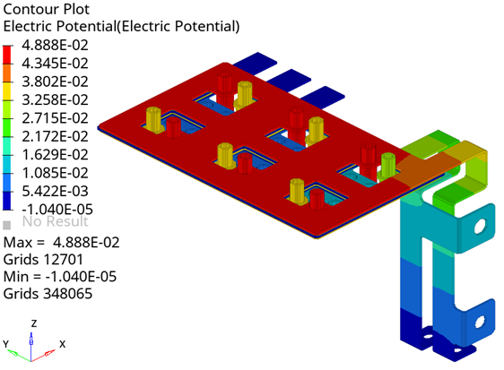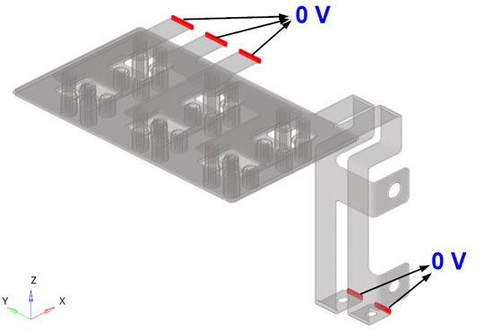 電気伝導解析では、電気負荷を受ける構造内の電位の計算が行われます。
