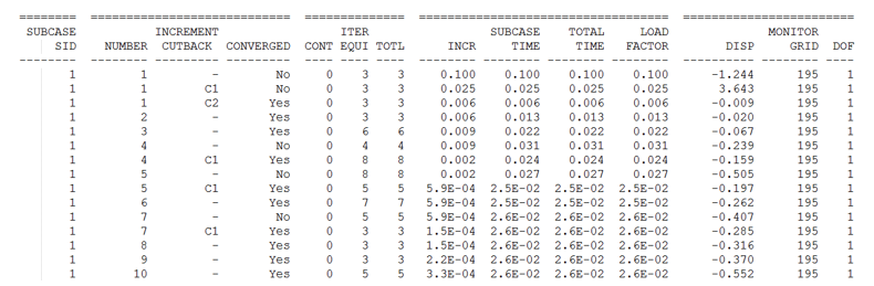 このファイルには、非線形サブケースごとに、荷重増分の表、カットバック情報、各荷重増分の反復計算回数、時間増分とカットバックの値、および変位結果が含まれます。