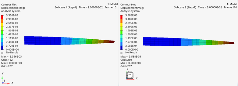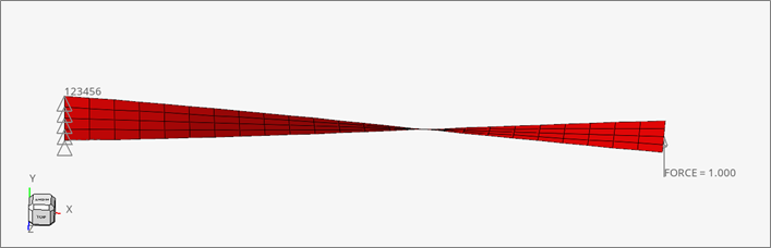 梁は、並進および回転方向のx、y、zが拘束されています。梁の端には荷重がかかります。解析では、2つのサブケースが実行されます。1つは、TTERM 0.002、もう1つはTTERM 0.005とDYREL (Dynamic Relaxation)が含まれます。静的または準静的問題を実行することで、動的振動を回避します。この解析は、OptiStruct's Explicit via ANALYSIS = NLEXPLを用いて実行します。