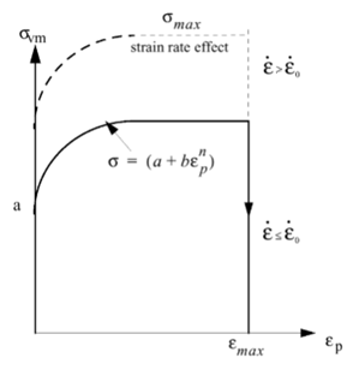 ひずみ速度は、引張または破壊における衝突パフォーマンスで、材料特性に大きな影響を与えます。Johnson-Cook理論では、降伏応力は直接ひずみ速度の影響を受け、次のように表されます:(2) σ=( a+b ε p n )( 1+cln ε ˙ ε ˙ 0 ) MathType@MTEF@5@5@+= feaagKart1ev2aqatCvAUfeBSjuyZL2yd9gzLbvyNv2CaerbuLwBLn hiov2DGi1BTfMBaeXatLxBI9gBaerbd9wDYLwzYbItLDharqqtubsr 4rNCHbGeaGqiVu0Je9sqqrpepC0xbbL8F4rqqrFfpeea0xe9Lq=Jc9 vqaqpepm0xbba9pwe9Q8fs0=yqaqpepae9pg0FirpepeKkFr0xfr=x fr=xb9adbaqaaeGaciGaaiaabeqaamaabaabaaGcbaGaeq4WdmNaey ypa0ZaaeWaaeaacaWGHbGaey4kaSIaamOyaiabgwSixlabew7aLnaa BaaaleaacaWGWbaabeaakmaaCaaaleqabaGaamOBaaaaaOGaayjkai aawMcaamaabmaabaGaaGymaiabgUcaRiaadogaciGGSbGaaiOBamaa laaabaGafqyTduMbaiaaaeaacuaH1oqzgaGaamaaBaaaleaacaaIWa aabeaaaaaakiaawIcacaGLPaaaaaa@4D90@