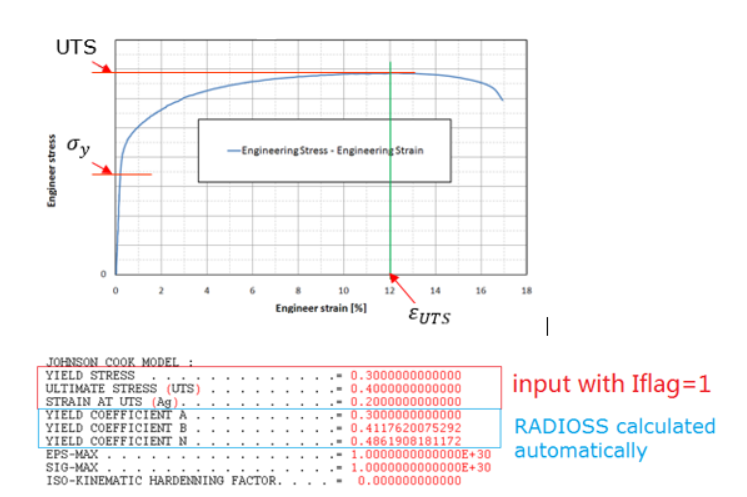 この新しい入力では、ネッキングポイントでの降伏応力( σ y ), 引張り強さ(UTS)および工学ひずみ( ε U T S MathType@MTEF@5@5@+= feaagKart1ev2aqatCvAUfeBSjuyZL2yd9gzLbvyNv2CaerbuLwBLn hiov2DGi1BTfMBaeXatLxBI9gBaerbd9wDYLwzYbItLDharqqtubsr 4rNCHbGeaGqiVu0Je9sqqrpepC0xbbL8F4rqqrFfpeea0xe9Lq=Jc9 vqaqpepm0xbba9pwe9Q8fs0=yqaqpepae9pg0FirpepeKkFr0xfr=x fr=xb9adbaqaaeGaciGaaiaabeqaamaabaabaaGcbaGaeqyTdu2aaS baaSqaaiaadwfacaWGubGaam4uaaqabaaaaa@3A55@ )が必要です。この新しい入力により、Radiossは自動的に a MathType@MTEF@5@5@+= feaagKart1ev2aqatCvAUfeBSjuyZL2yd9gzLbvyNv2CaerbuLwBLn hiov2DGi1BTfMBaeXatLxBI9gBaerbd9wDYLwzYbItLDharqqtubsr 4rNCHbGeaGqiVu0Je9sqqrpepC0xbbL8F4rqqrFfpeea0xe9Lq=Jc9 vqaqpepm0xbba9pwe9Q8fs0=yqaqpepae9pg0FirpepeKkFr0xfr=x fr=xb9adbaqaaeGaciGaaiaabeqaamaabaabaaGcbaGaamyyaaaa@36DD@ b MathType@MTEF@5@5@+= feaagKart1ev2aqatCvAUfeBSjuyZL2yd9gzLbvyNv2CaerbuLwBLn hiov2DGi1BTfMBaeXatLxBI9gBaerbd9wDYLwzYbItLDharqqtubsr 4rNCHbGeaGqiVu0Je9sqqrpepC0xbbL8F4rqqrFfpeea0xe9Lq=Jc9 vqaqpepm0xbba9pwe9Q8fs0=yqaqpepae9pg0FirpepeKkFr0xfr=x fr=xb9adbaqaaeGaciGaaiaabeqaamaabaabaaGcbaGaamyyaaaa@36DD@ および n MathType@MTEF@5@5@+= feaagKart1ev2aqatCvAUfeBSjuyZL2yd9gzLbvyNv2CaerbuLwBLn hiov2DGi1BTfMBaeXatLxBI9gBaerbd9wDYLwzYbItLDharqqtubsr 4rNCHbGeaGqiVu0Je9sqqrpepC0xbbL8F4rqqrFfpeea0xe9Lq=Jc9 vqaqpepm0xbba9pwe9Q8fs0=yqaqpepae9pg0FirpepeKkFr0xfr=x fr=xb9adbaqaaeGaciGaaiaabeqaamaabaabaaGcbaGaamyyaaaa@36DD@ の等価値を計算します。
