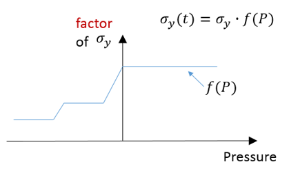 fct_IDpは、特定の材料における引張と圧縮の挙動の区別(圧力依存降伏)に使用されます。したがって、有効降伏応力は公称降伏応力に実際の圧力に対応する降伏係数を乗じることによって得られます。