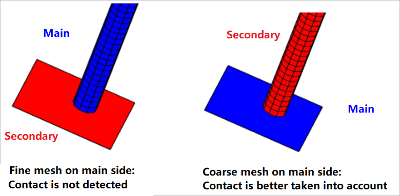 接触が自己接触でも対称接触でもない場合は、接触を良好に検出できるように、メイン側に粗いメッシュを選択することをお勧めします。接触が自己接触または対称接触である場合は、すべての要素と節点がメインとセカンダリの両方になるので、そのようなメッシュ選択は不要です。