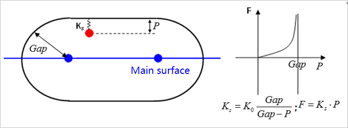 シミュレーション時のインターフェース剛性は貫通量pの非線形関数であり、セカンダリ節点がメインセグメントにきわめて近くなると無限大の値に近付きます。これは、セカンダリ節点とメインセグメントとの交差を防止し、適切な表現の節点とすることを目的とした措置です。