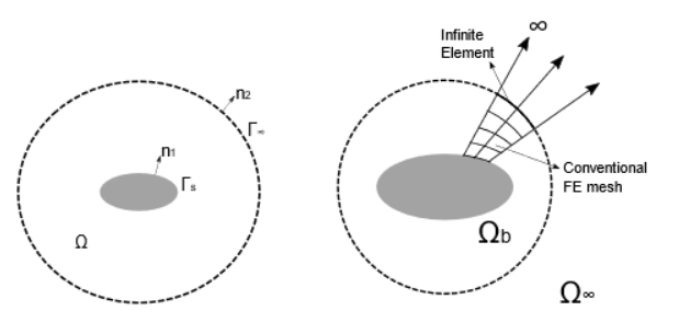 Considering the domain in the figure above, the region surrounding the structure (shaded area) is modeled using a conventional fluid FE mesh, and the far field is modeled using infinite elements defined on a 2D interface between the finite and infinite (unbounded) domains.