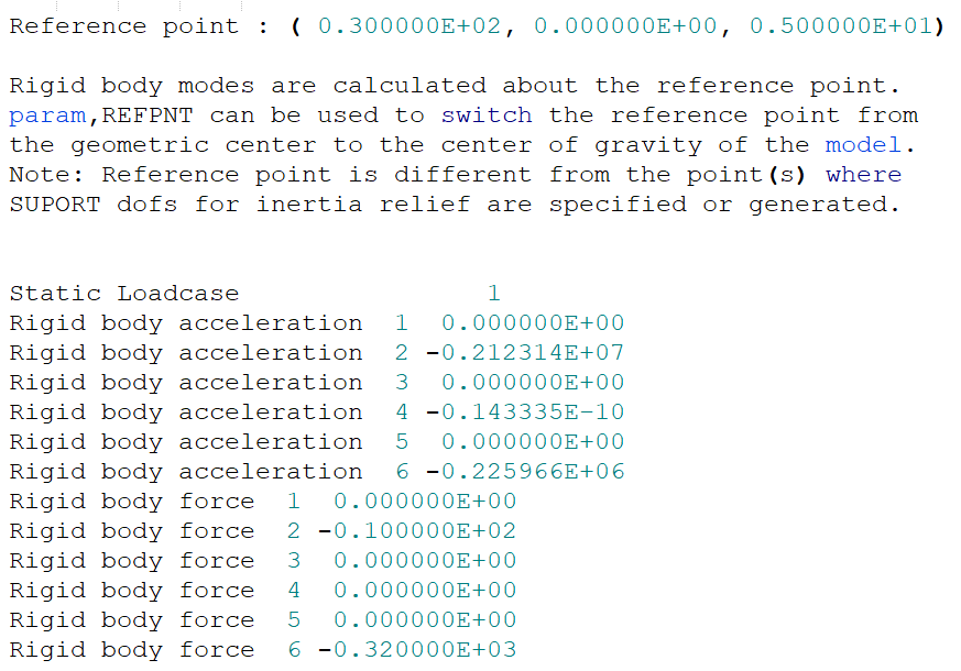 For static analysis of structures with rigid body modes, inertia relief calculations can be included in the solution process. In particular, structures with non-structural masses may be significantly influenced by inertia relief effects. PARAM,INREL,-1 or PARAM,INREL,-2 can be used to allow the inclusion of inertia relief calculations.