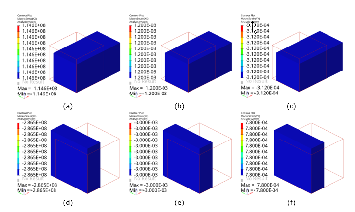 Figure 9. Built-in Macro Simulation in Multiscale Designer (Contour Plots). (a) and (d) x-direction stress in tension and compression, respectively; (b) and (e) x-direction strains in tension and compression, respectively; and (c) and (f) y-direction strains in tension and compression, respectively