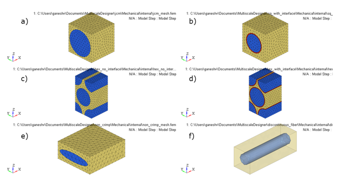 Figure 14. Fibrous Unit Cell Models. (a) square packing array; (b) square packing array with an interface; (c) hexagonal packing array; (d) hexagonal packing array with interface; (e) non-crimp ellipsoidal fabric; and (f) discontinuous fiber packing array