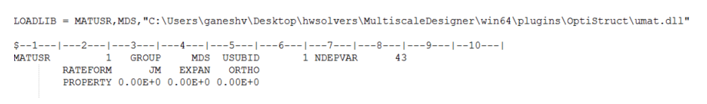 User-defined structural material properties are available using MATUSR. .dll or .so libraries can be referenced via the LOADLIB entry. For more information, refer to User-Defined Structural Material in the User Guide.