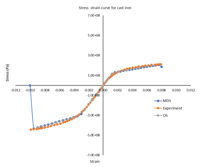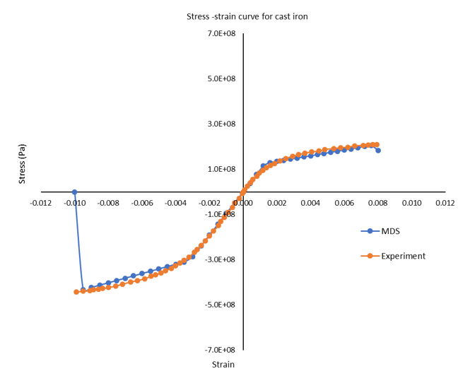 Figure 10. Stress-Strain Curve of Cast Iron from Multiscale Designer and Experiment