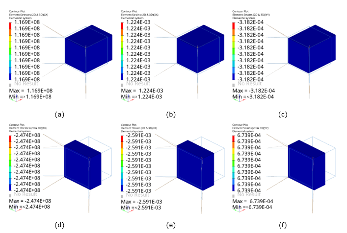 Figure 12. Structural Analysis in OptiStruct (Contour Plots). (a) and (d) x-direction stress in tension and compression, respectively; (b) and (e) x-direction strains in tension and compression, respectively; and (c) and (f) y-direction strains in tension and compression, respectively