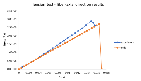 Figure 16. Comparison of Stress-Strain Curves. fiber-axial tensile test from Multiscale Designer and experiment
