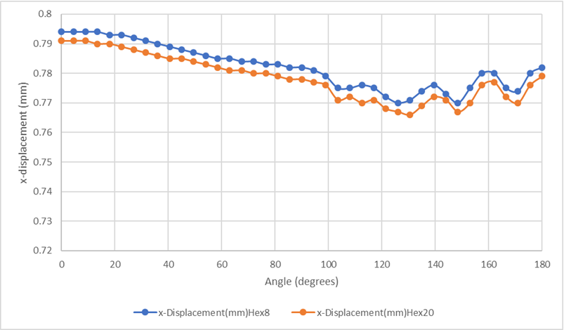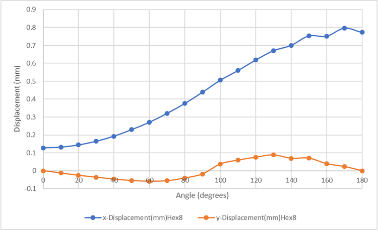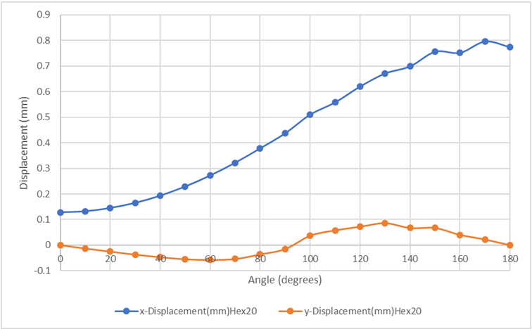 Figure 4. Displacement in x-direction for nodes along the pin as a function of the angle