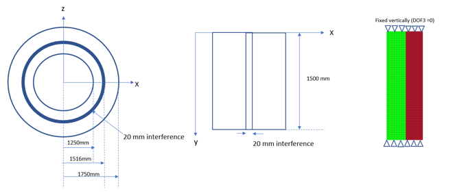 The model examines the contact pressure between two cylinders in case of interference fit of 20 mm.