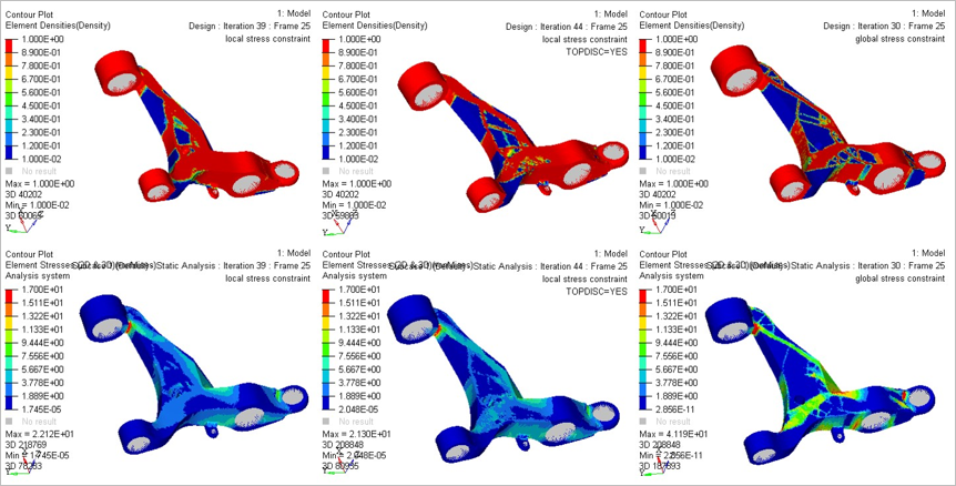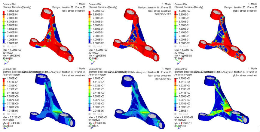 stress results of a linear static analysis for iteration 0 and iteration 44 (Figure 2). Figure 3. Element Density Contour Figure 4. Element Density Contour (different view)