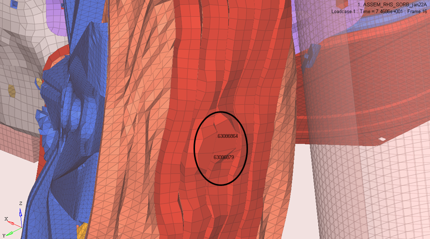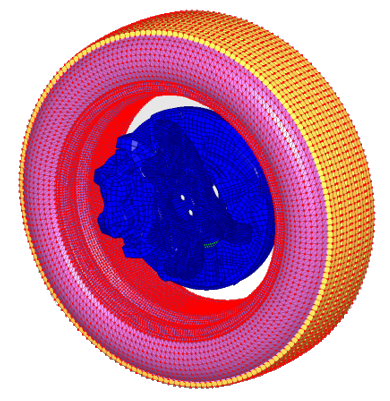 Figure 3.For example, the tire stack up against the rigid barrier. Behind the tire, the brake disk (or caliber) compresses the tire against the barrier. The global contact is not stiff enough and leads to large penetrations.- Stiffness increased