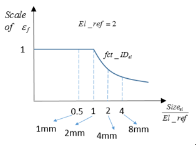 - failure strain scale factor as a function of the normalized element size (defined via fct_IDel), and is the reference element size used to normalize the element size