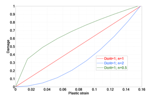 - Damage due to diffuse necking is linear if Fad_exp=1 is used. Increasing the Fad_exp leads to more energy dissipated during damage. Figure 13 shows the influence of Fad_exp from 1 to 10 in stress-strain curve. It is recommend to use a Fad_exp value of 5 to 10.