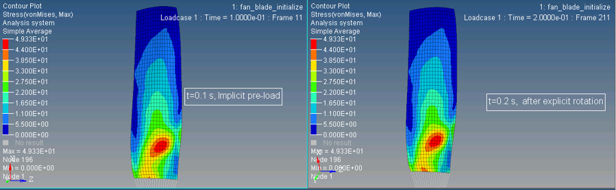 Figure 3. Comparison of Stress after Centrifugal Load in Implicit and Explicit Rotation
