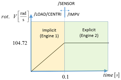 In a second Engine file an initial velocity is applied to the model and a /SENSOR is used to deactivate the /LOAD/CENTRI force and apply an imposed velocity to the blades center of rotation.