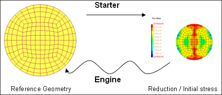 Radioss Starter generates initial stresses by following the same law; which is used by the fabric (/MAT/LAW19 (FABRI)) from the reference geometry (defined in the reference file) to the initial geometry (defined in Runname_0000.rad).