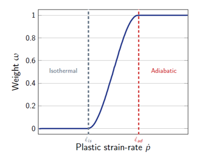 Figure 3. Evolution of the temperature weight with the plastic strain rate