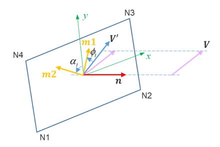 The reference vector is projected on the shell element plane and becomes the vector . For IP=23, vector after projection is additionally multiplied by shell normal vector to become Then for each layer, the 1st material direction (m1) is vector turned degrees (turns positive direction around shell normal ).