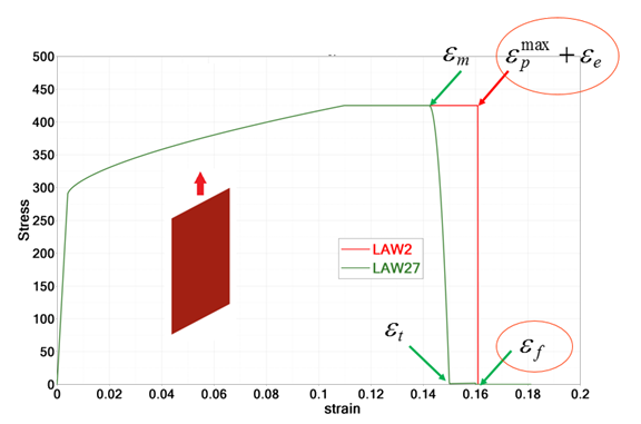 different failure treatment. LAW2 checks with plastic strain and LAW27 checks with