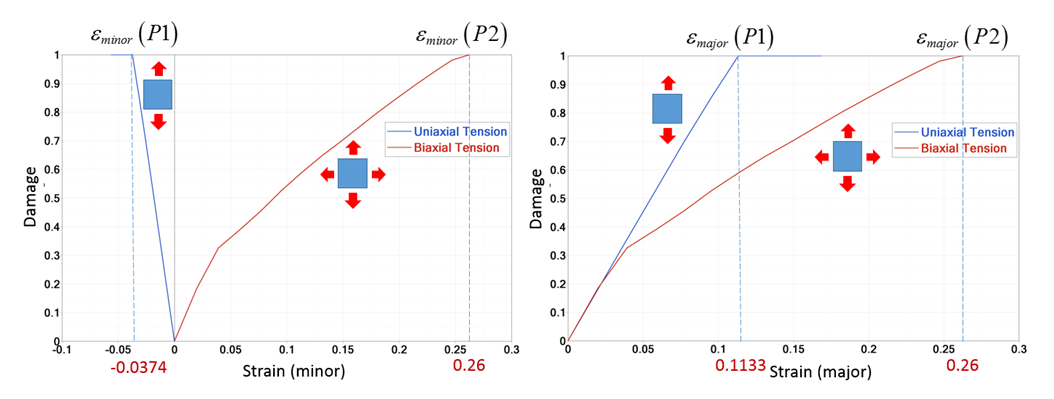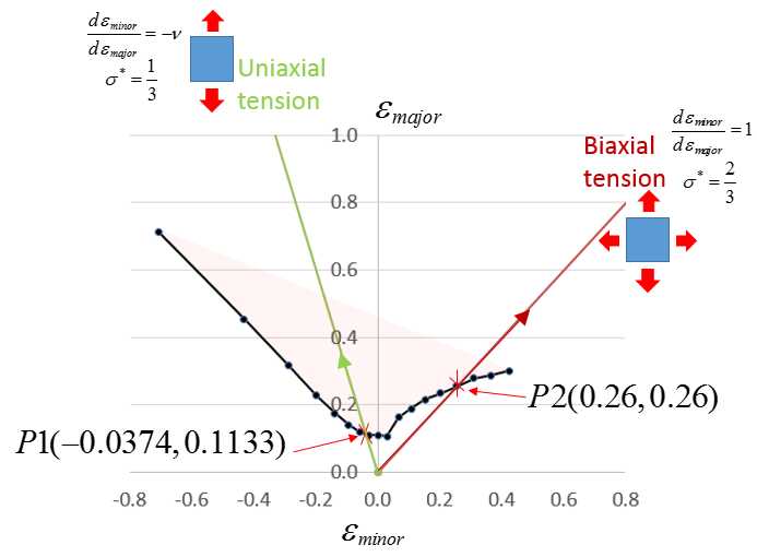 - In eqibiaxial test (by ) once point P2(0.26,0.26) is reached, the element fails