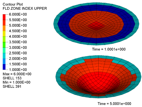 In Radioss it is possible to simulate failure with a failure model. FLD failure models are most commonly used for forming, which describe material failure in strain space. Here, one shell element and circular plate model are used to demonstrate the failure behavior with FLD failure model.