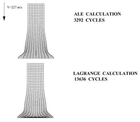 It can be seen that the cylinder mesh using ALE remains regular, unlike the Lagrange method, where large element deformation creates very small and skewed elements. This reduces the time step, leading to more time step cycles. However, each ALE cycle takes longer than a Lagrangian.