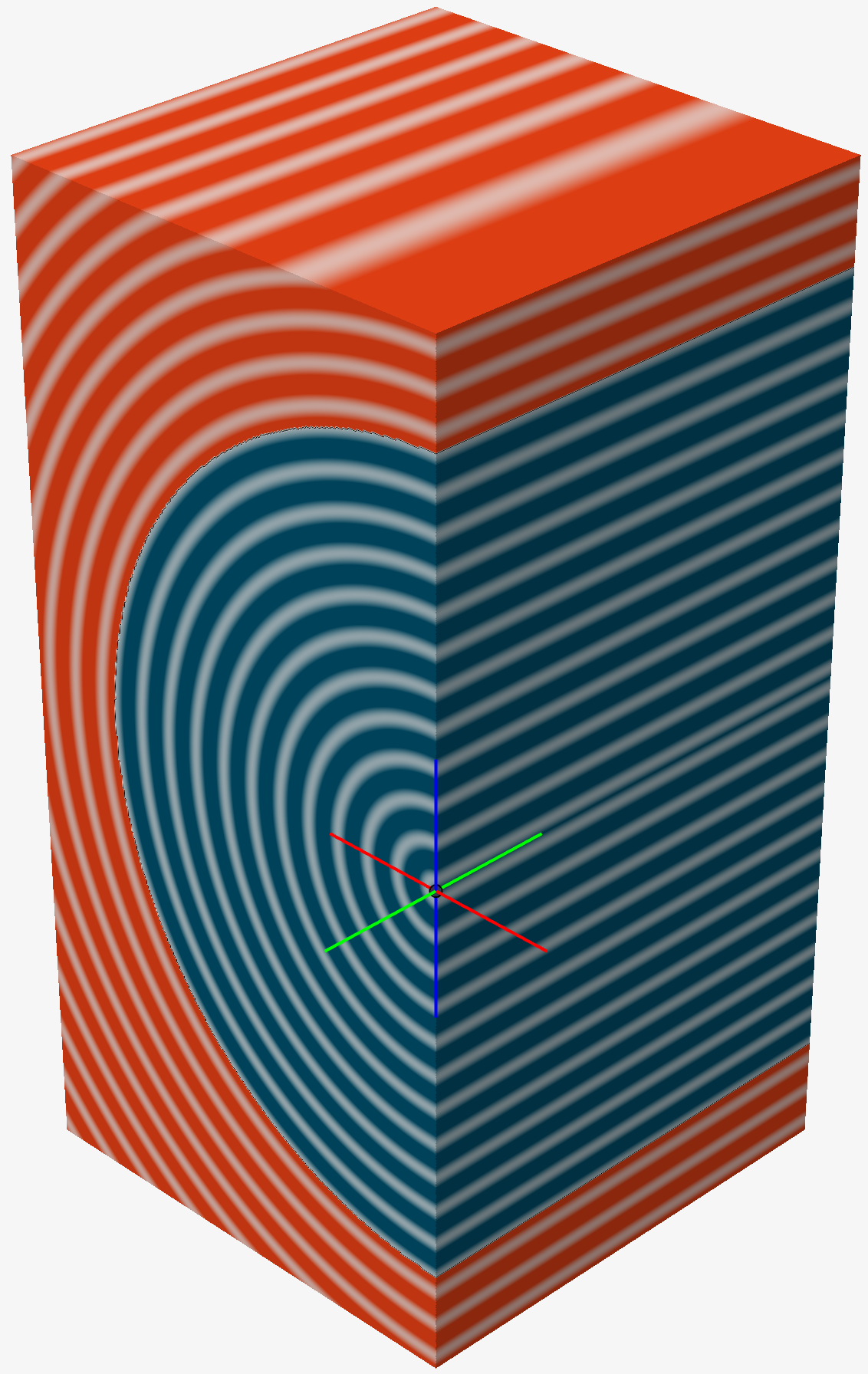 图 2. SDF 的第二个例子. 这是将场可视化的另一种方式。此图显示了表示与绿轴对齐的圆柱体的场的截面视图(圆柱体本身已被隐藏)。SDF 的内部和外部区域均可见,内部区域以蓝色和白色条纹着色,外部区域以橙色和白色条纹着色。这些条纹表示标量值在空间中的变化方式。对于 SDF,这些条纹将均匀分布且不会扭曲,如此处所示。
