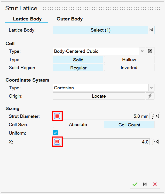 图 9. 支柱格栅结构参数. 继续上面的支柱格栅结构示例,可以使用场驱动设计来控制支柱直径和单位单元格尺寸。下面以红色突出显示的“场”小按钮可以清楚地表明这一点。使用此方法时,您应该设置所有非场驱动的参数(例如单位单元格类型),然后使用相关的场按钮就地创建场。在支柱格栅结构中,通过点击“支柱直径”旁边的场按钮创建场,然后使用全局 z 平面 (z=0) 定义该场。