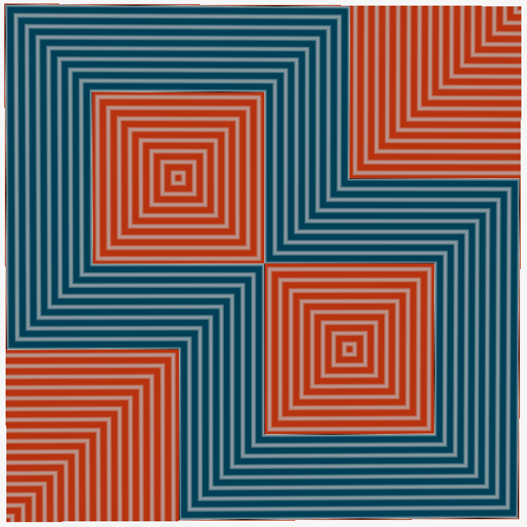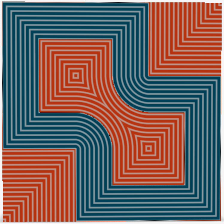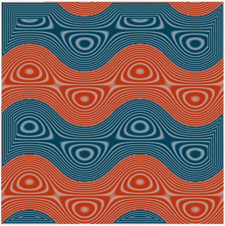 图 3. 类距离标量场的示例. 作为说明性示例,请考虑此图,它显示了 Gyroid 格栅字结构场的截面视图。尽管在后台对场进行了一些重新调整以改善类距离属性,但通过仔细观察发现,条纹(例如蓝色和白色)间隔不均匀,并且在远离曲面时会变得扭曲。这是因为 Gyroid 格栅结构的基础方程会产生类距离标量场,而不是 SDF。