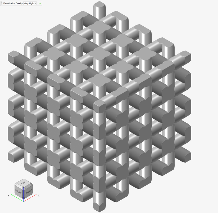 “为什么锐边看起来很圆润?”尽管许多场在技术上具有无限分辨率,但它们最终还是使用 3D 网格进行采样。该网格的粗细度由“可视化质量”控制。如果网格无限精细,锐边就会非常锐利。随着网格变得更粗糙以匹配可用的计算资源,在渲染和任何后续转换(例如三角形网格)中,锐边会变得有些圆润。为了说明这一点,下面的两张图分别以“极低”和“极高”可视化质量显示了相同的格栅结构。为了最大限度地减少这种影响,用户应该以计算机可以承受的最高可视化质量完成设计,甚至可能使用自定义质量。