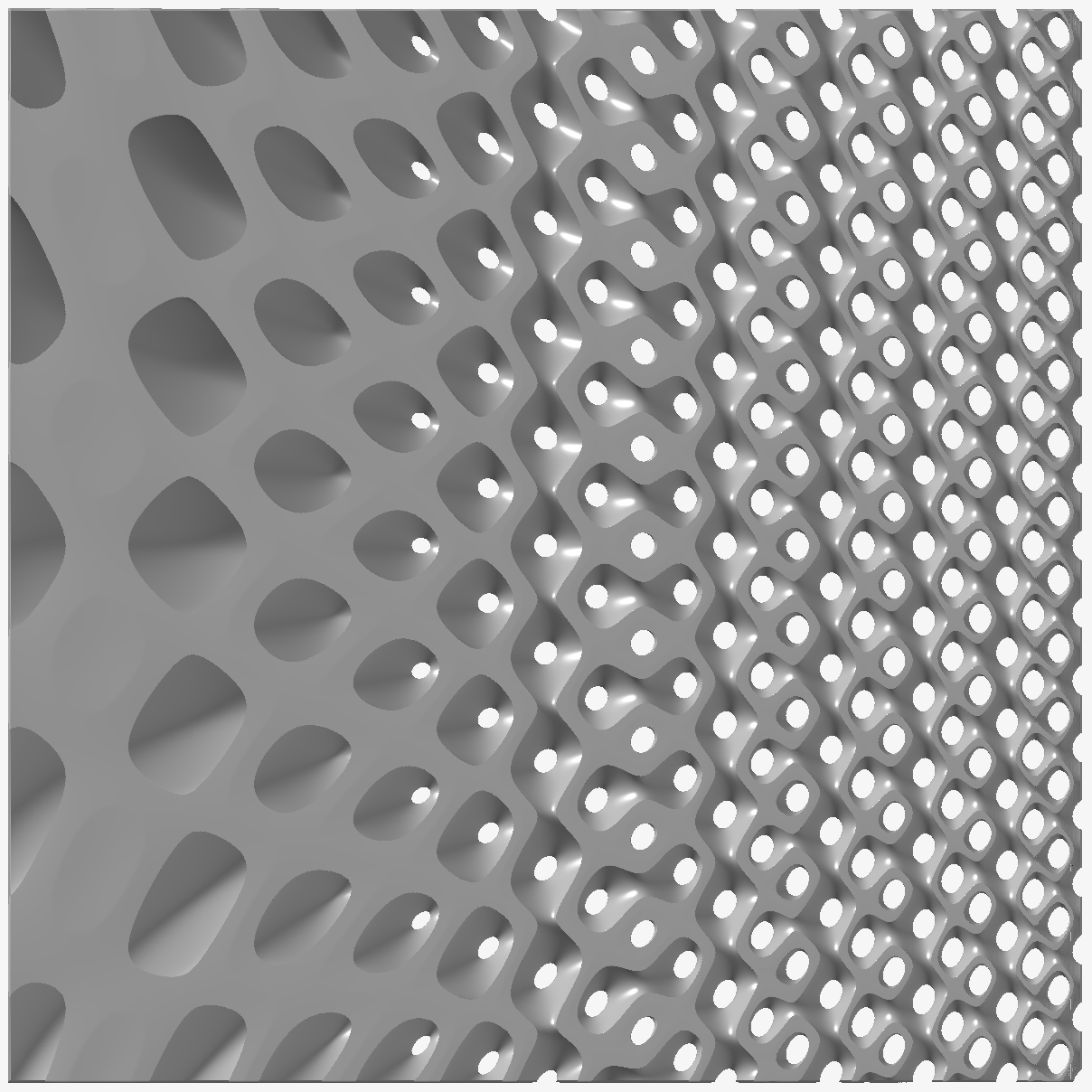 - 以前,常规格栅结构是通过在 x、y 和 z 方向上复制和平移几何体单位单元格来创建的(见上图)。这意味着无法平滑地增加格栅结构上单位单元格的数量。在隐式建模中没有这样的限制,其中单位单元格的数量可以在格栅结构中平滑变化,如下所示。