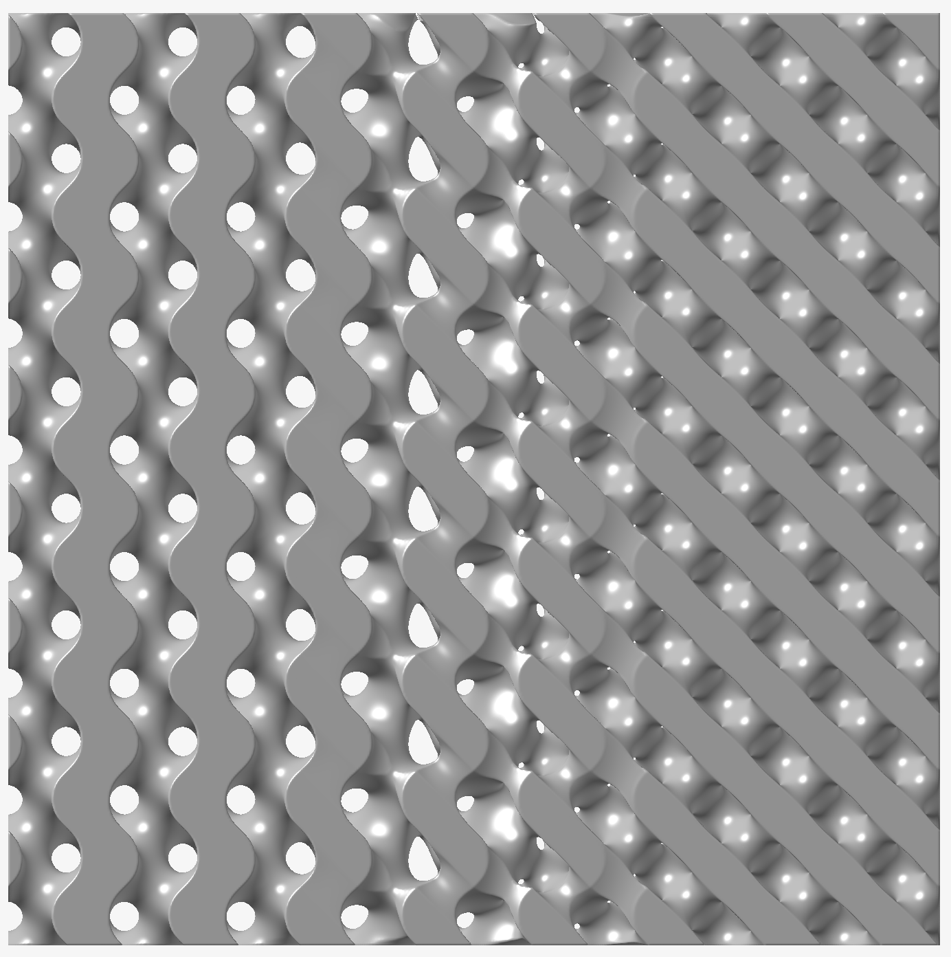 - 甚至可以将格栅结构设计与变形操作相结合,以平滑地从一个格栅结构单位单元过渡到另一个格栅结构单位单元。下图显示了一个 Gyroid 变形为 Schwarz D 格栅结构,从左向右移动。