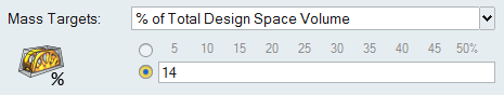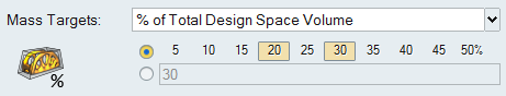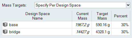 如果运行拓扑优化,而且模型中有多个设计空间,可以给每个设计空间单独设定质量目标。选择该选项可打开一个表格,此时可在表格所示列表中为各个设计空间分别设定一个目标质量。在该表格中可以直接输入质量目标,也可以将目标设定为设计空间质量的百分比。