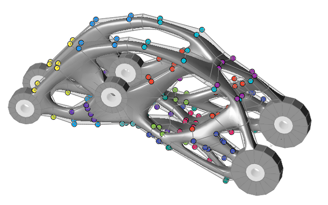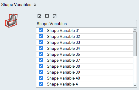 形状变量要求运行 PolyNURBS 形状优化,并且可以使用 PolyNURBS 功能区的“形状变量”工具来定义。形状变量定义的是包络点的运动,形状优化则通过修改这些位置来更新形状。