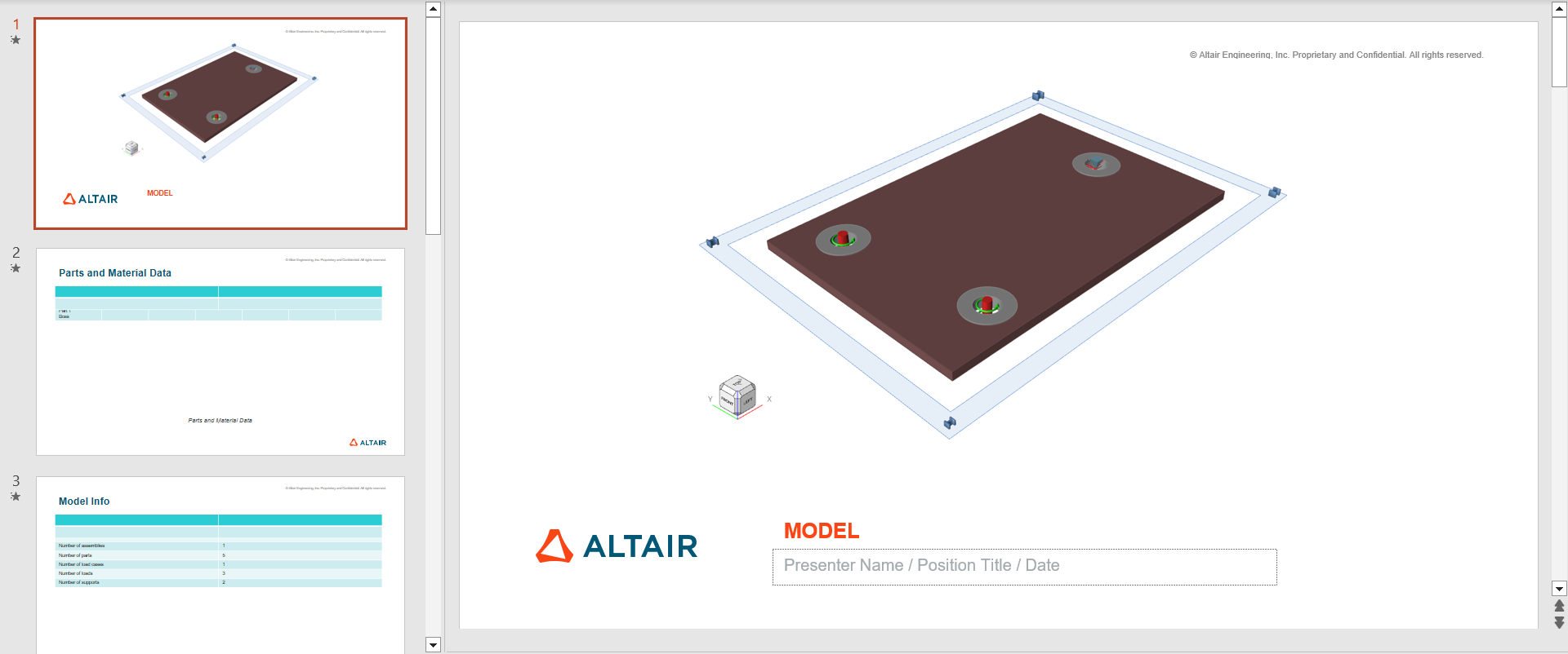 使用保存的设置生成结构分析报告。您可以导出为 PPT 或 PDF 格式。报告包括材料数据、模型信息、运行设置、载荷工况信息和图像以及结果。